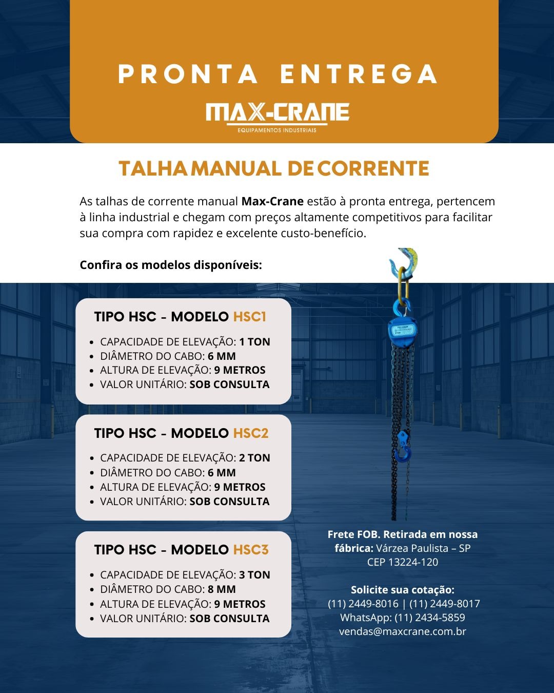 Atenção – talhas manuais disponíveis à pronta entrega em março de 2026 (enquanto durar o estoque). Em outros períodos, por favor consulte a disponibilidade: